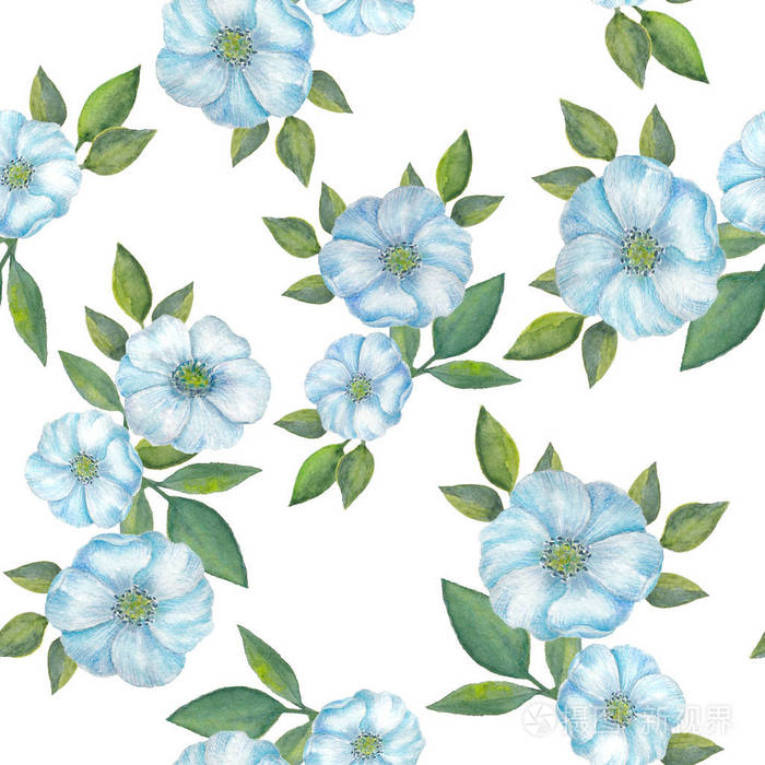 水彩蓝色的花朵和叶子 水彩手绘插图孤立在白色背景上 无缝图案与花叶为背景壁纸 纺织卡 包装纸打印 照片 正版商用图片11id3o 摄图新视界